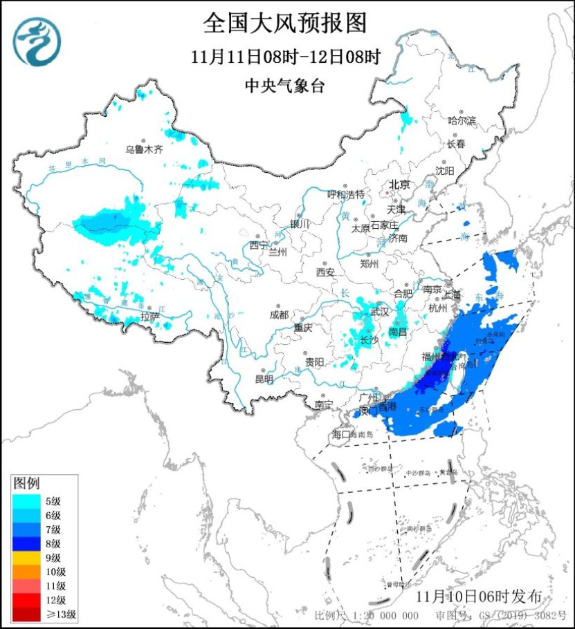 11月10日08時至11日08時,內(nèi)蒙古中東部、遼寧西部、安徽中南部、河南南部、江蘇南部、上海、湖北南部、湖南東北部、江西北部、浙江北部及東部沿海、福建沿海、臺灣島沿海等地有5~6級、陣風(fēng)7~8級的大風(fēng);黃海大部海域、東海大部海域、臺灣海峽、臺灣以東洋面偏北海域、南海東北部偏北海域?qū)⒂?~8級、陣風(fēng)9~10級的大風(fēng)。11月11日08時至12日08時,安徽南部、湖北中東部、湖南大部、江西中北部、廣西東北部以及福建沿海、廣東東部沿海、臺灣島沿海等地有5~6級、陣風(fēng)7~8級的大風(fēng);東海大部海域、臺灣海峽、臺灣以東洋面、南海北部海域、巴士海峽偏北海域?qū)⒂?~8級、陣風(fēng)9~10級的大風(fēng)。中央氣象臺11月10日06時繼續(xù)發(fā)布大風(fēng)藍(lán)色預(yù)警(見圖2、3)。
