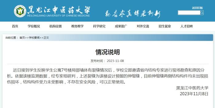 中新網(wǎng)11月9日電 據(jù)黑龍江中醫(yī)藥大學(xué)網(wǎng)站消息,近日,黑龍江中醫(yī)藥大學(xué)接到學(xué)生反映學(xué)生公寓7號(hào)樓局部墻體有裂縫情況后,學(xué)校立即邀請(qǐng)省內(nèi)結(jié)構(gòu)專(zhuān)家進(jìn)行現(xiàn)場(chǎng)勘查和原因分析。依據(jù)該樓監(jiān)測(cè)數(shù)據(jù),經(jīng)專(zhuān)家組研判,上述裂縫為該樓設(shè)計(jì)預(yù)留的伸縮縫,目前伸縮縫兩側(cè)結(jié)構(gòu)構(gòu)件均未出現(xiàn)損傷損壞,結(jié)構(gòu)構(gòu)件受力未受影響,不存在安全風(fēng)險(xiǎn),可以正常使用。