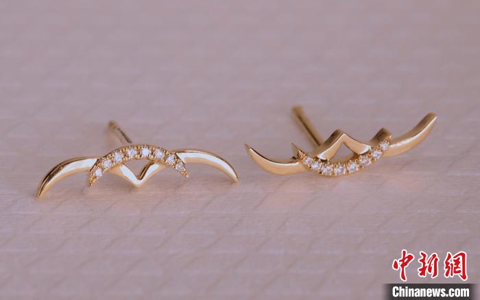 此次展出的女書珠寶作品有戒指、手鏈、胸針、項(xiàng)鏈、耳環(huán)等?!斑@是以女書中的‘春’字設(shè)計(jì)的耳飾,采用了藍(lán)色琺瑯和白色寶石相結(jié)合的設(shè)計(jì)?!备呔杲榻B說(shuō),從不同角度看耳飾,會(huì)呈現(xiàn)不同的藍(lán)、白主色面,亦如女性有著豐富的“多面”。