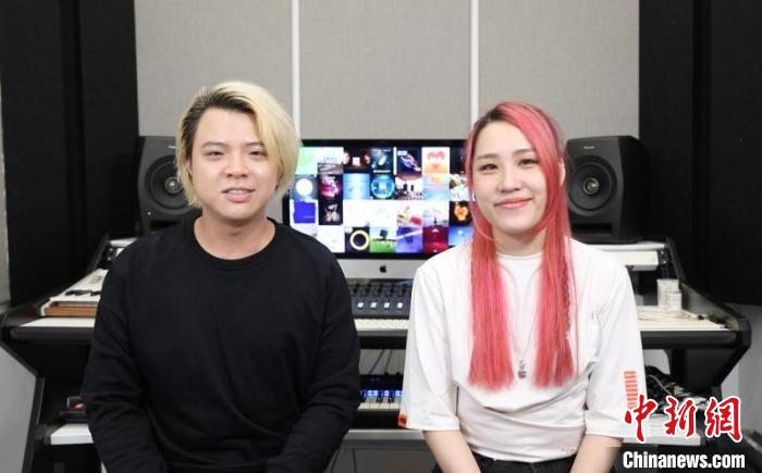 2月16日,來自臺(tái)灣臺(tái)北的“夫妻檔”電音組合黃杰妮(右)和李仕翔(左)接受采訪?!≈行律缬浾? 張亨偉 攝