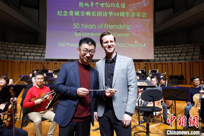 11月10日,中國(guó)交響樂團(tuán)和費(fèi)城交響樂團(tuán)在北京互贈(zèng)禮物。圖為中國(guó)交響樂團(tuán)首席指揮李心草(左)和費(fèi)城交響樂團(tuán)指揮特里斯坦·瑞斯·舍曼。中新社記者富田攝