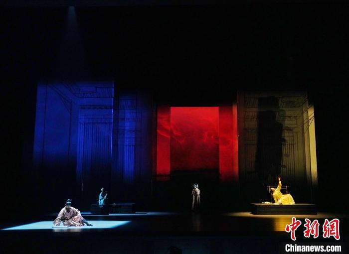 數塊錯落有致的幕屏在推移、旋轉、組合、分離間巧妙構建出豐富多變的戲劇時空,時而是竹林幽幽、流水潺潺的蘭亭,時而是大幅《蘭亭集序》卷軸,時而又幻化成威嚴肅穆的大殿。悠揚的古琴、清脆的竹笛、空靈的簫聲,在寬厚的弦樂映襯下令人沉醉;急促綿密的鼓點、聲如號角的銅管扣人心弦,訴說著舞臺上人物心境的跌宕起伏、劇中時局的動蕩不安。