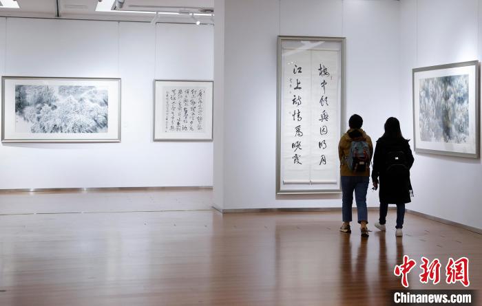 展覽共設(shè)八個(gè)單元,余魁君的國畫作品分為北國玉山、冰鄉(xiāng)幽居、雪中君子、雁陣鶴舞四個(gè)篇章。其中“北國玉山”,呈現(xiàn)祖國東北地區(qū)冰天雪地,山川如玉的壯麗景象;“冰鄉(xiāng)幽居”,描繪高士在冰雪世界山川鄉(xiāng)野中的詩意棲居;“雪中君子”,體現(xiàn)藝術(shù)家的寫生技巧,梅蘭竹菊四君子,在冰雪中傲然獨(dú)立;“雁陣鶴舞”,側(cè)重表現(xiàn)動(dòng)物在北國風(fēng)光中的活動(dòng)與精妙神態(tài)。