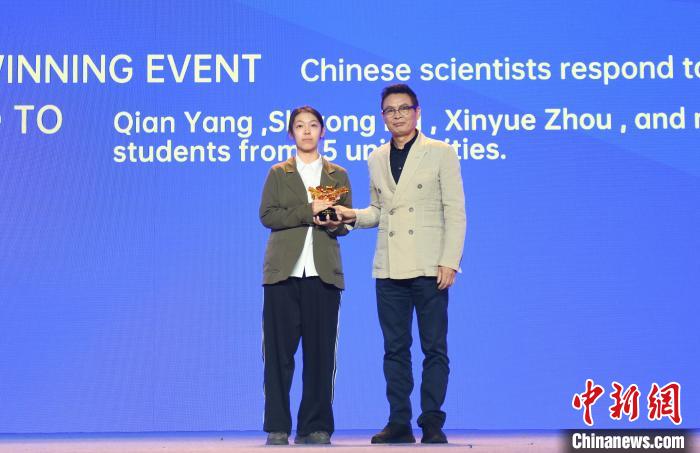 麥家(右)向張若彤(左)所在團(tuán)隊(duì)頒發(fā)2023菠蘿科學(xué)獎(jiǎng)科學(xué)事件獎(jiǎng)。中新社記者 王剛 攝