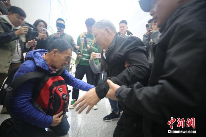 11月11日,去臺(tái)老兵陳有謙家屬在機(jī)場(chǎng)跪拜迎接劉德文(左)手中的骨灰。中新社發(fā) 張孝鵬 攝