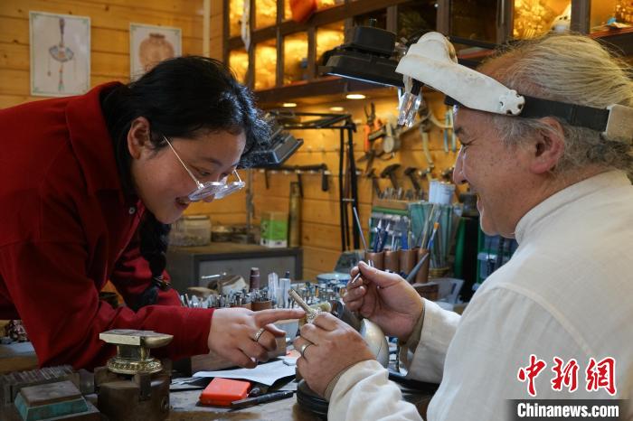 圖為金廣芝(右)和父親交流如何敲打銀塊?! ●R銘言 攝