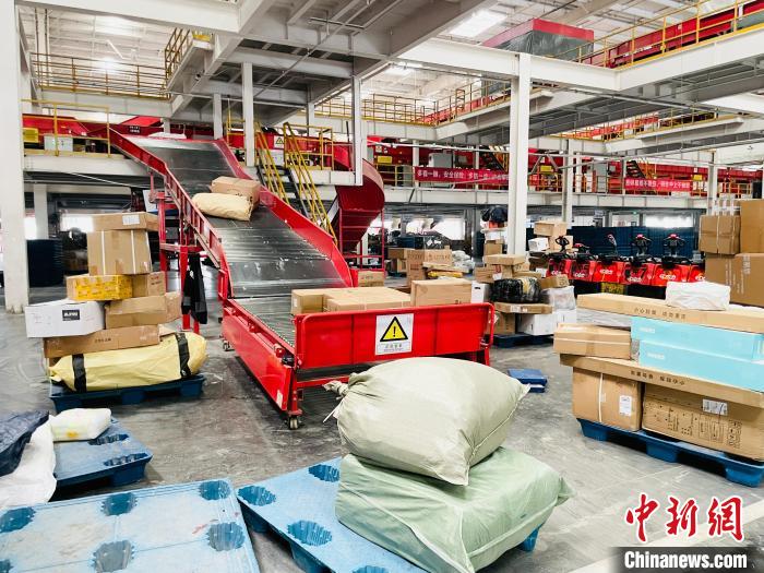 中新網(wǎng)重慶11月11日電(王婷婷)“雙十一”期間,記者隨“陸海之約”全國(guó)網(wǎng)絡(luò)媒體重慶行——西部陸海新通道主題傳播(重慶站)活動(dòng)中來到重慶江津區(qū)德邦快遞西南總部基地,各式各樣的包裹在傳輸帶上流動(dòng),工作人員開著叉車忙著運(yùn)輸大物件,倉(cāng)庫(kù)區(qū)內(nèi)一片繁忙景象。