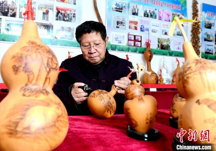 11月14日,烙畫藝人王海制作的花鳥題材葫蘆烙畫。武成軍 攝