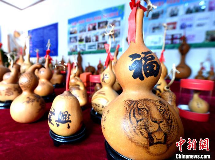 11月14日,烙畫藝人王海制作的老虎題材葫蘆烙畫。武成軍 攝