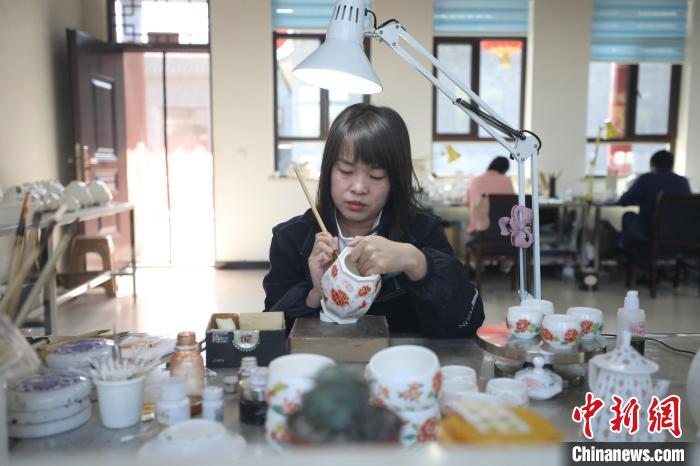 八義窯彩繪工作人員正在明亮的燈光下彩繪瓷器制品。國網(wǎng)山西長治上黨區(qū)供電公司供圖