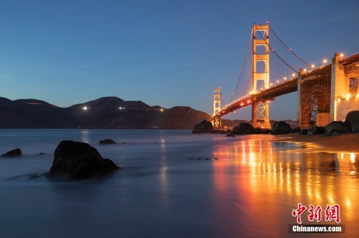 當(dāng)?shù)貢r(shí)間10月29日,美國(guó)舊金山金門大橋在海浪和夜色的襯托下美如一幅畫。中新社記者 劉關(guān)關(guān) 攝