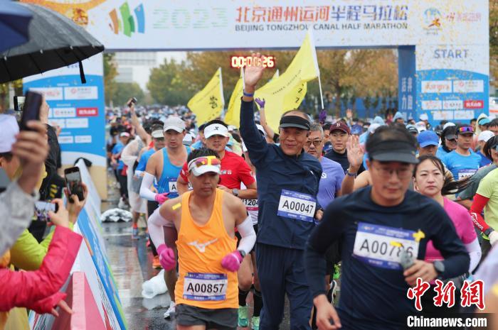 11月5日,2023北京通州運(yùn)河半程馬拉松在雨中鳴槍開(kāi)跑?!∮浾?賈天勇 攝