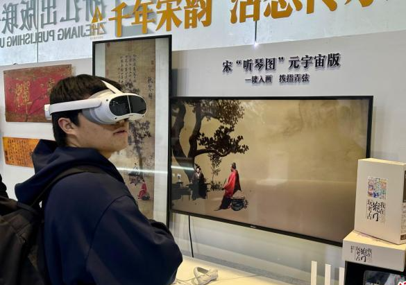 與之緊鄰的浙江展區(qū),宋代名畫《聽琴圖》也有了元宇宙版,觀眾戴上VR眼鏡即可“入畫”,以第三人稱或畫中人物的視角,深度感知松下?lián)崆儋p曲的意境?,F(xiàn)場工作人員周杰告訴記者,數(shù)字掃描、建模修復(fù)等技術(shù)讓古畫得以活態(tài)化傳承,“由于年代久遠(yuǎn),有些古畫可能會顏色較暗、模糊不清,我們以順應(yīng)當(dāng)下社會潮流的方式,還原出了古畫本來的樣子,觀眾也能更好地去理解古畫?!?/p>