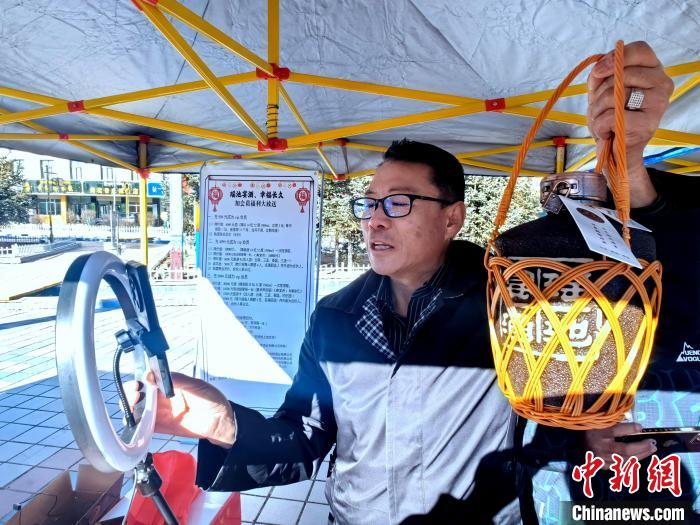 圖為參展商通過(guò)網(wǎng)絡(luò)直播推介青稞酒。李雋攝