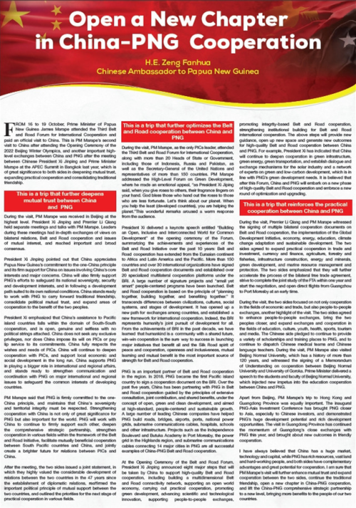 2023年10月26日,駐巴布亞新幾內(nèi)亞大使曾凡華在巴新主流媒體《信使郵報(bào)》和《國(guó)民報(bào)》發(fā)表署名文章《開(kāi)啟中巴新合作新篇章》,全文如下:
