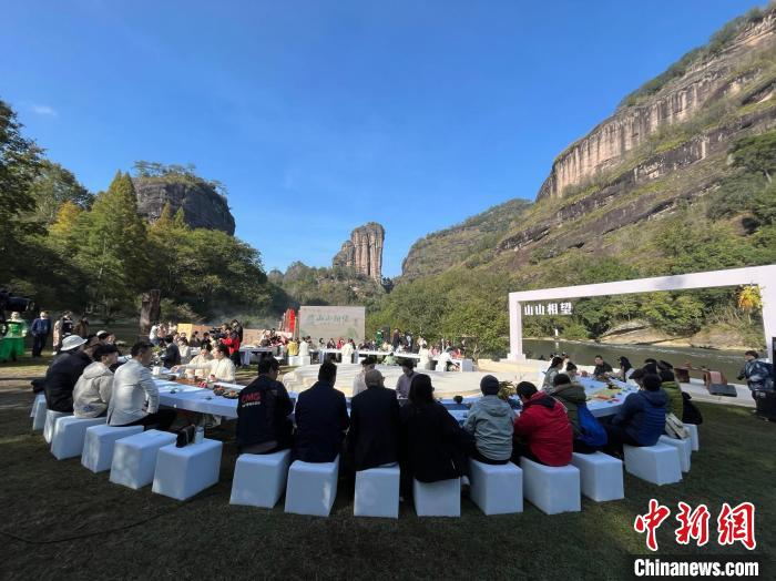 活動當天,嘉賓們參觀了武夷精舍,乘坐竹筏游覽九曲溪,匯聚到了九曲溪畔、玉女峰下。現(xiàn)場設置的特色茶席,將武夷巖茶、臺灣烏龍、宋代點茶元素融為一體,沉浸式地為來賓們呈現(xiàn)了大紅袍、文山包種、老巖茶三款兩地茶葉。