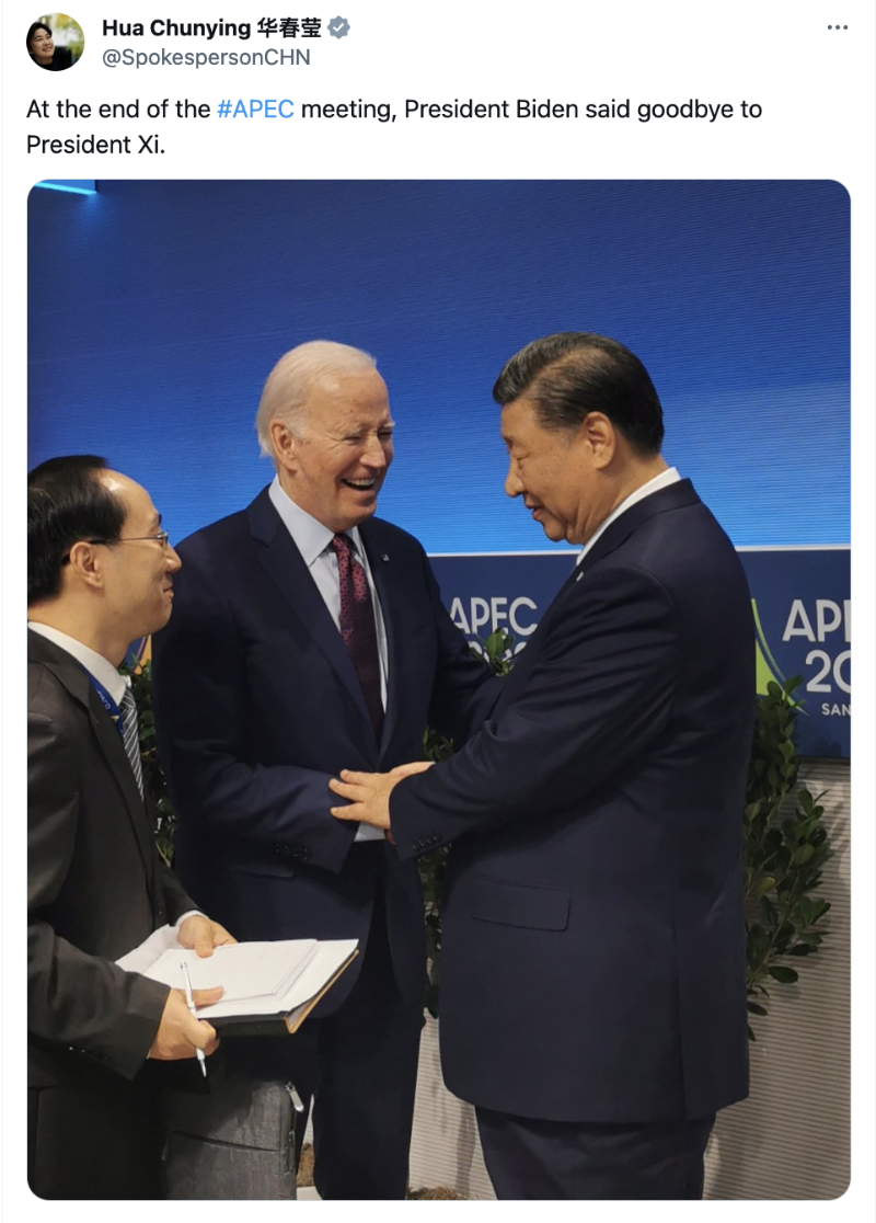 美國舊金山當(dāng)?shù)貢r間17日,亞太經(jīng)合組織(APEC)第三十次領(lǐng)導(dǎo)人非正式會議結(jié)束時,美國總統(tǒng)拜登與國家主席習(xí)近平話別。