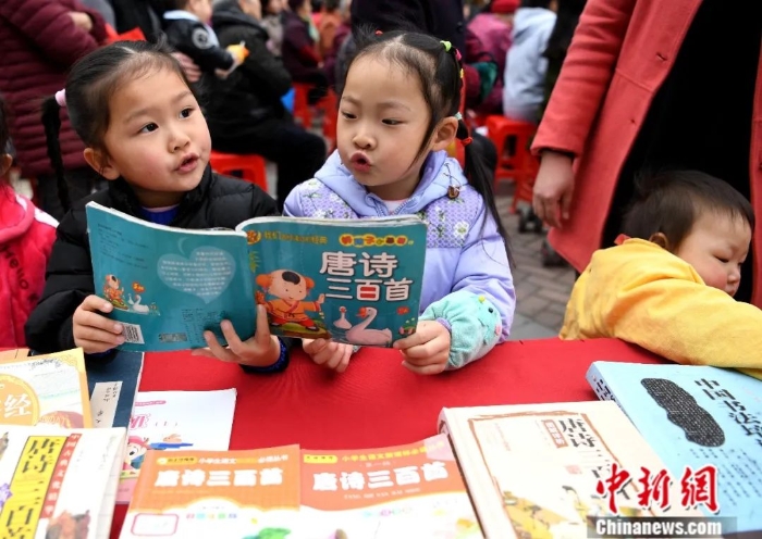 2017年3月,安徽合肥,小朋友在閱讀唐詩(shī)三百首。韓蘇原 攝