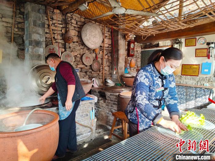 “我做粉皮30多年了,‘粉皮卷大蔥’是我獨(dú)創(chuàng)的美食,銷量最好時(shí)一天要做1000多張粉皮?!秉S家粉皮第五代傳承人黃樹青正在竹泉村的粉皮坊內(nèi)制作當(dāng)?shù)孛浴胺燮ぞ泶笫[”。剛出鍋的粉皮配上新鮮的大蔥、黃瓜,再撒上花生、辣椒醬和芝麻鹽,綿軟筋道,口感豐富,深受游客喜愛。