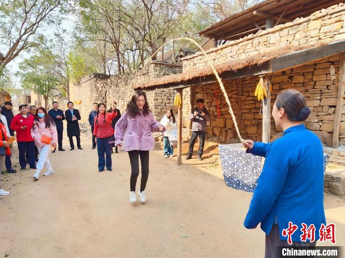 媒體記者在沂蒙紅色影視基地內(nèi)體驗(yàn)跳繩游戲。王采怡 攝