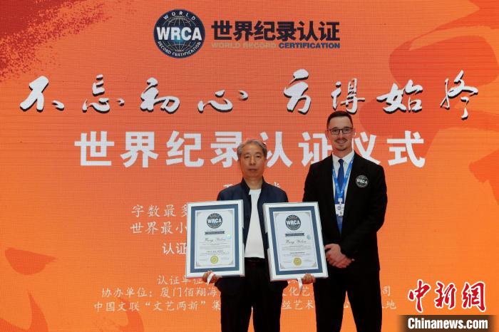中新網(wǎng)廈門11月18日電(記者 楊伏山)旅京廈門書法家王業(yè)樓創(chuàng)作的《大方廣佛華嚴(yán)經(jīng)》、《金剛經(jīng)》極限微楷作品,17日在世界紀(jì)錄認(rèn)證機(jī)構(gòu)(WRCA)官方認(rèn)證官馬克西姆的現(xiàn)場見證下,一舉創(chuàng)造“字?jǐn)?shù)最多的佛教經(jīng)典極限微楷作品”和“世界最小的《金剛經(jīng)》極限微楷作品”兩項(xiàng)世界紀(jì)錄。