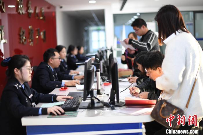 圖為群眾在派出所大廳辦理“一窗通辦”業(yè)務(wù)?!√旖蚴泄簿帜祥_分局王頂?shù)膛沙鏊﹫D