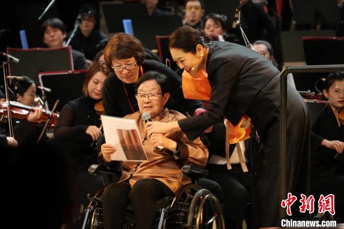 “綠葉對(duì)根的情誼——谷建芬作品交響合唱音樂會(huì)”現(xiàn)場(chǎng),圖為89歲的谷建芬親臨舞臺(tái)。 中國(guó)東方演藝集團(tuán)供圖