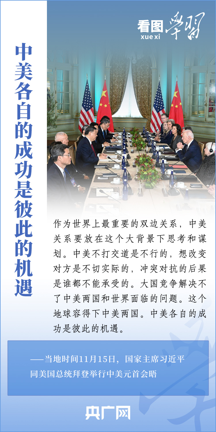 當?shù)貢r間11月15日,國家主席習近平在美國舊金山斐洛里莊園同美國總統(tǒng)拜登舉行中美元首會晤。兩國元首就事關(guān)中美關(guān)系的戰(zhàn)略性、全局性、方向性問題以及事關(guān)世界和平和發(fā)展的重大問題坦誠深入地交換了意見。習近平主席指出,大國競爭解決不了中美兩國和世界面臨的問題。這個地球容得下中美兩國。中美各自的成功是彼此的機遇。一起來學習!