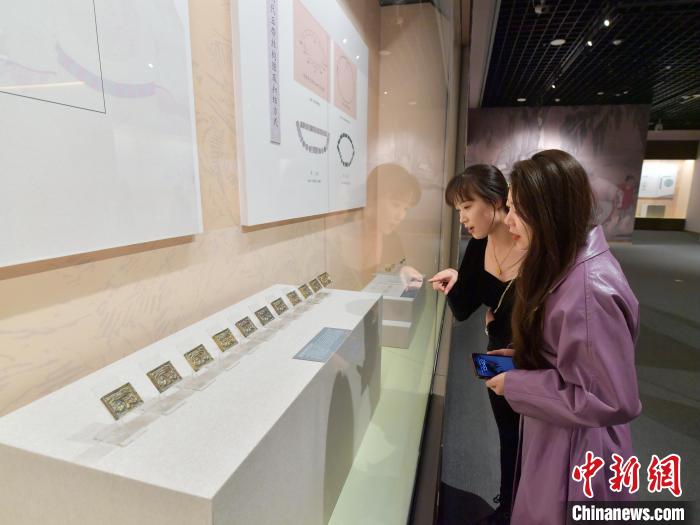 10月31日,吉林長春,在“束帶衿莊——吉林省博物院帶具展”中,市民正在觀賞展出的銀鎏金花樹鸞鳳帶銙。 劉棟 攝