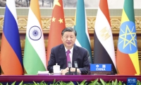 11月21日晚,國家主席習(xí)近平出席金磚國家領(lǐng)導(dǎo)人巴以問題特別視頻峰會并發(fā)表題為《推動?;鹬箲?zhàn) 實現(xiàn)持久和平安全》的重要講話。新華社記者 劉彬 攝