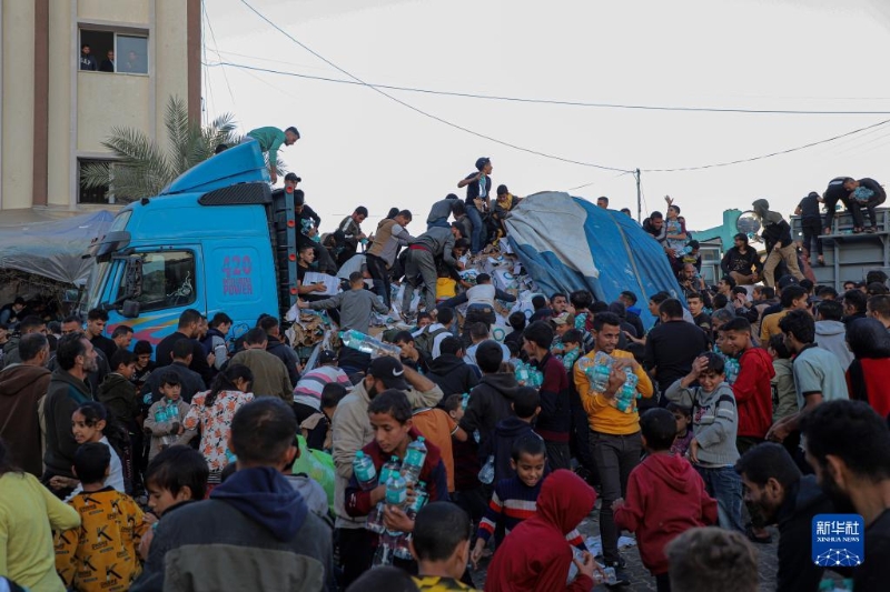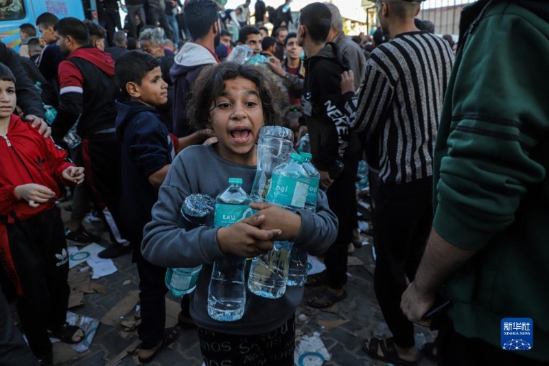 11月21日,在加沙地帶南部城市汗尤尼斯,民眾領(lǐng)取飲用水。新華社發(fā)(里澤克·阿卜杜勒賈瓦德攝)