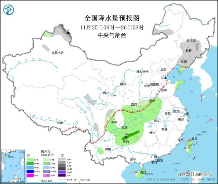 11月25日08時(shí)至26日08時(shí),新疆北疆北部、內(nèi)蒙古東北部、黑龍江南部、吉林中部、遼寧中北部、青海南部、陜西中南部、河南西部、川西高原等地部分地區(qū)有小雪或雨夾雪,其中,吉林中東部、新疆北疆北部等地部分地區(qū)有中到大雪,局地暴雪(10~11毫米)。陜西南部、河南大部、湖北大部、湖南西部、四川盆地西南部、貴州大部、海南島、臺(tái)灣島大部等地部分地區(qū)有小到中雨(10~18毫米)(見圖7)。