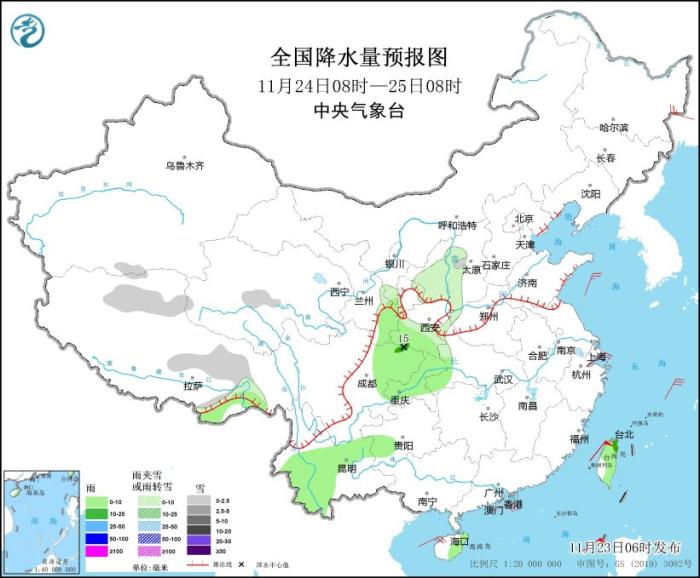 11月24日08時(shí)至25日08時(shí),西藏北部和東部、青海中部、甘肅東部、寧夏南部、陜西中北部、山西西部、湖北西北部等地部分地區(qū)有小雪或雨夾雪。西藏東南部、甘肅東南部、陜西南部、四川東北部、重慶大部、湖北西部、貴州西南部、云南中部和西南部、臺(tái)灣島等地部分地區(qū)有小到中雨(10~15毫米)。內(nèi)蒙古中東部、東北地區(qū)、山東和江蘇東部、新疆南疆盆地、青海西部、甘肅西北部及西藏西部等地有5~6級(jí)、陣風(fēng)7~8級(jí)的大風(fēng),局地陣風(fēng)可達(dá)9級(jí);黃海中部、東海大部、臺(tái)灣海峽、臺(tái)灣以東洋面、巴士海峽、南海北部和中部、南海西南部部分海域?qū)⒂?~8級(jí)、陣風(fēng)9級(jí)的大風(fēng),其中臺(tái)灣海峽的風(fēng)力可達(dá)9級(jí)、陣風(fēng)10級(jí)(見圖6)。