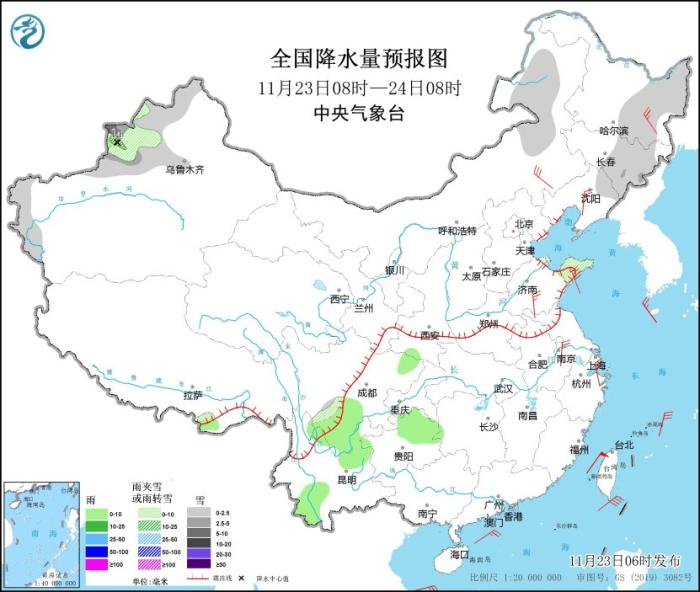 11月23日08時(shí)至24日08時(shí),內(nèi)蒙古東北部、黑龍江中東部、吉林中東部、新疆北疆西部和伊犁河谷、南疆西部高海拔地區(qū)以及山東半島北部等地部分地區(qū)有小到中雪或雨夾雪,其中,新疆伊犁河谷局地有大雪。陜西南部、四川盆地東北部和南部、貴州中北部、云南東北部和西南部等地部分地區(qū)有小雨。內(nèi)蒙古中東部、東北地區(qū)西部、華北東部、山東、新疆北部和南疆盆地東南部、甘肅西部、青海西部、西藏西北部等地有5~6級(jí)、陣風(fēng)7~8級(jí)的大風(fēng),局地陣風(fēng)可達(dá)9級(jí);渤海、渤海海峽、黃海大部、東海大部、臺(tái)灣海峽、巴士海峽、南海東北部、中東部和西南部等部分地區(qū)將有7~8級(jí)、陣風(fēng)9級(jí)的大風(fēng)(見圖5)。