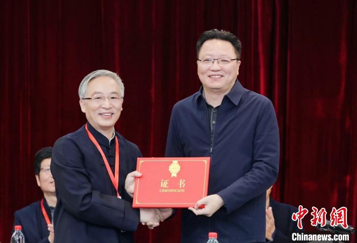 浙江省文化和旅游廳黨組書記、廳長陳廣勝(右)為新當選會長楊建武頒發(fā)證書。浙江省文物局供圖