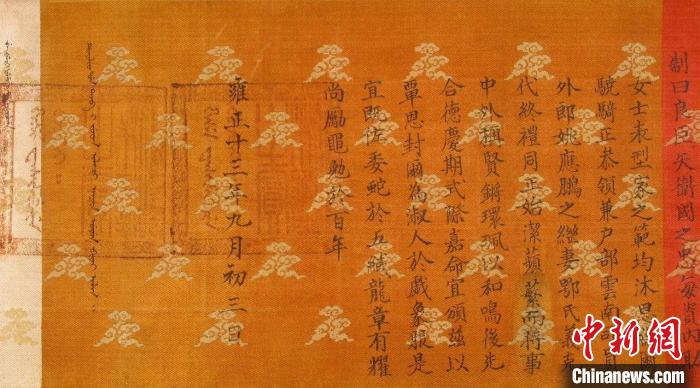 圖為《雍正十三年誥命卷》。此誥命是赤橙黃赭紫五彩織錦云紋地,用滿漢兩種文字墨書而成。(遼寧省博物館供圖)