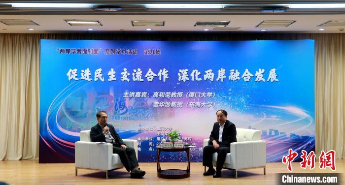 中新網(wǎng)廈門11月24日電 (記者 楊伏山)由廈門大學(xué)和中華文化學(xué)院共同主辦的“兩岸學(xué)者面對(duì)面”系列活動(dòng)第九場(chǎng)23日晚在廈門大學(xué)舉辦。廈門大學(xué)教授高和榮與臺(tái)灣東海大學(xué)教授曾華源以“促進(jìn)民生交流合作,深化兩岸融合發(fā)展”為主題展開對(duì)談。