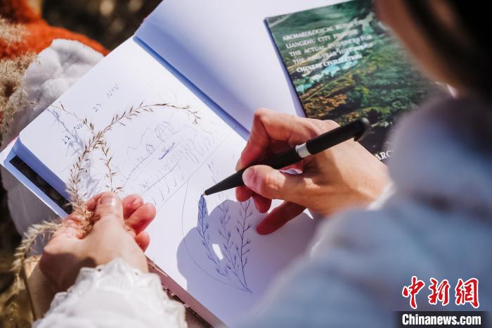 藝術家在良渚古城遺址公園采風時進行創(chuàng)作。良管委 供圖