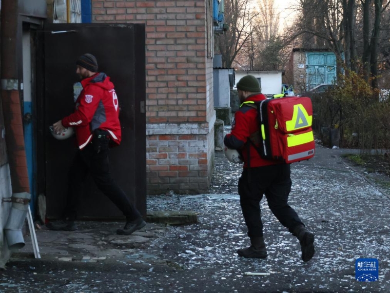 11月25日,烏克蘭紅十字會(huì)救援人員在基輔市一棟遭空襲的居民樓實(shí)施清理和救助工作。