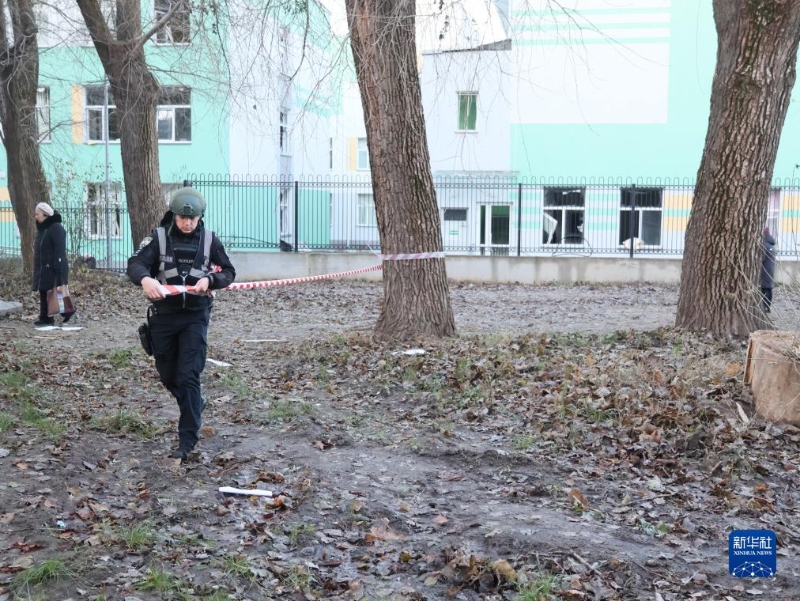 11月25日,在烏克蘭基輔市,執(zhí)法人員封鎖空襲現(xiàn)場(chǎng)。