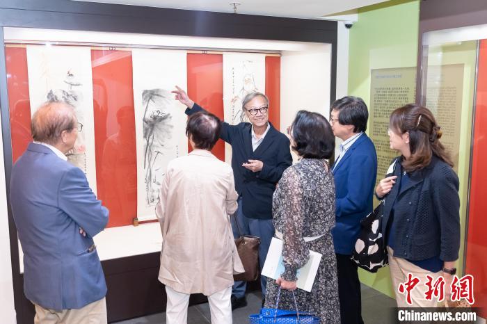 楊春棠向觀眾介紹饒宗頤與嶺南四君子合作畫。一新美術館 供圖