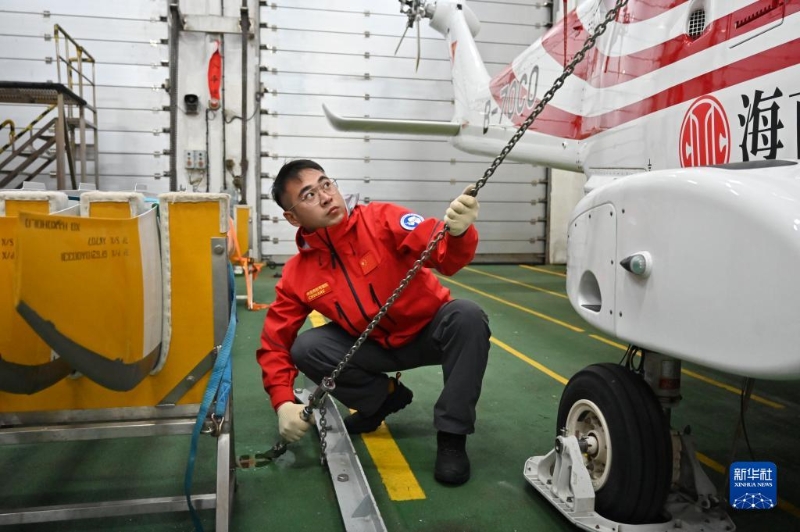 11月26日,“雪龍2”號(hào)機(jī)械員王法檢查加固直升機(jī)系留。