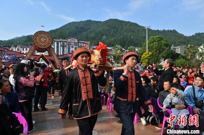 瑤族禮生獻(xiàn)上整豬、整雞,挑起水果和糍粑、酒水等貢品。陳秋霞 攝