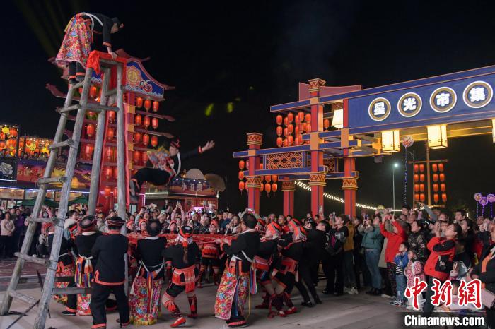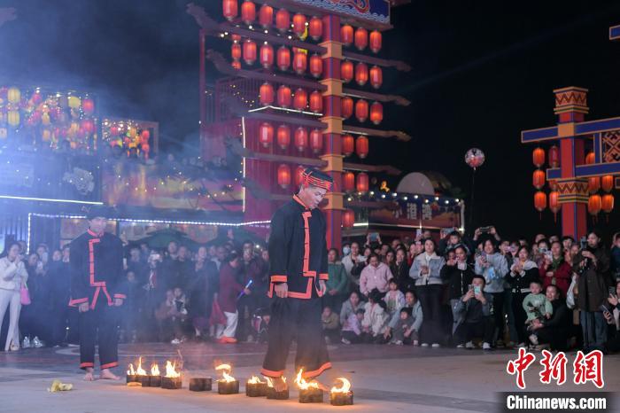 11月23日晚,金秀上演瑤族特色非遺絕技表演吸引眾多游客。羅午鈺 攝