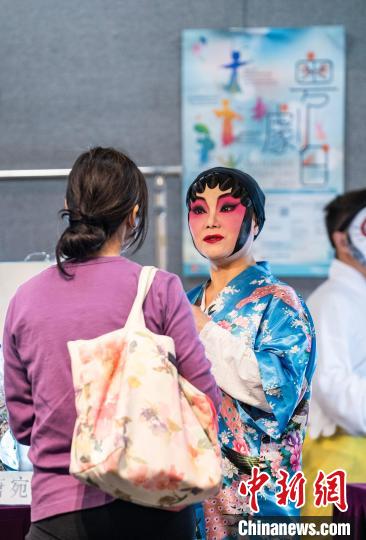 圖為一名粵劇演員與市民交流。中新網(wǎng)記者 侯宇 攝