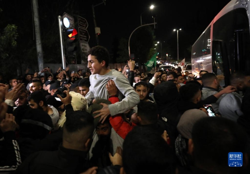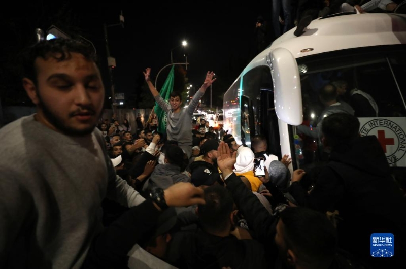 11月26日,載有獲釋巴勒斯坦被關(guān)押人員的大巴抵達(dá)約旦河西岸城市拉姆安拉。