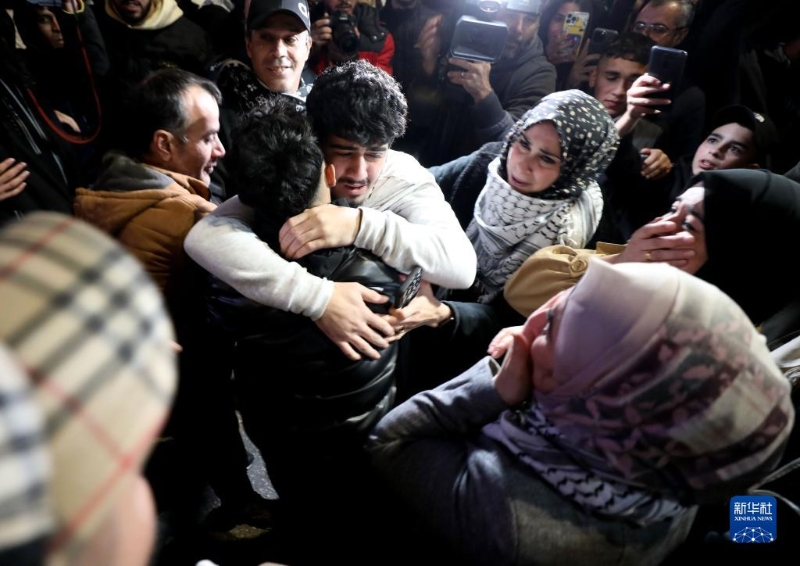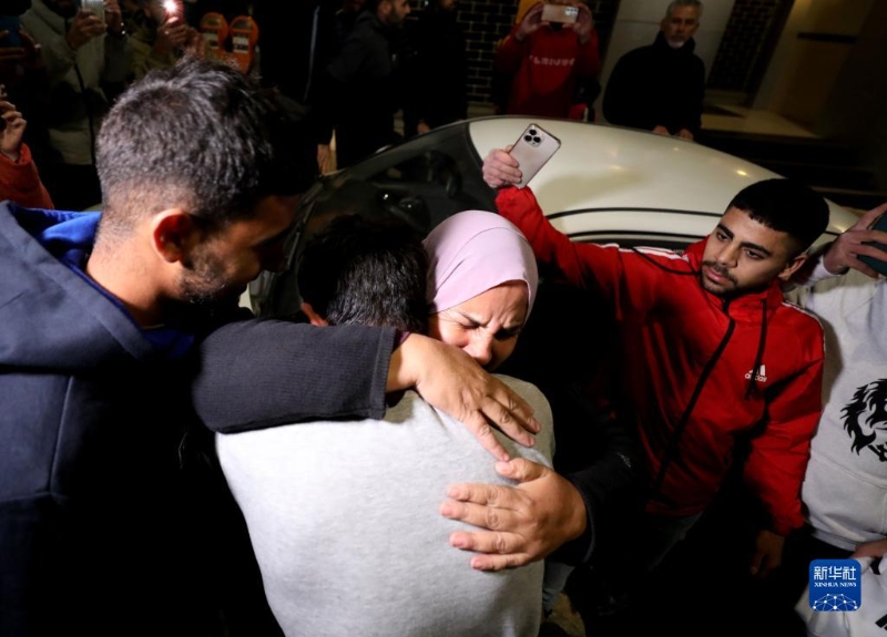 11月26日,在約旦河西岸城市拉姆安拉,獲釋的巴勒斯坦人與親人團(tuán)聚。