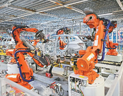 在華晨寶馬沈陽鐵西工廠某車間,機器臂在焊接車身。新華社記者 楊 青攝