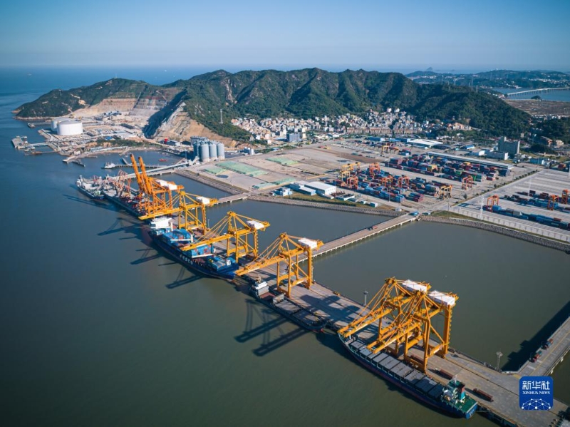 11月22日,貨輪停靠在溫州港狀元岙集裝箱碼頭卸載集裝箱(無人機照片)。