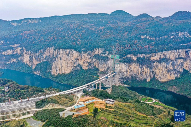 這是11月26日拍攝的位于重慶市酉陽(yáng)土家族苗族自治縣龔灘鎮(zhèn)的阿蓬江大橋施工建設(shè)現(xiàn)場(chǎng)(無(wú)人機(jī)照片)。